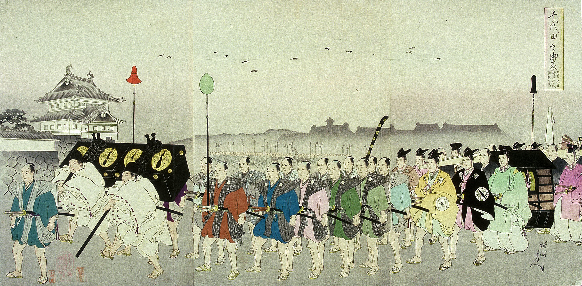 参勤交代の時期は、はじめは毎年4月と定められていたが、やがて1年在府・1年在国の原則が確立した。供数の規模は年々大規模で華美になった。少ない大名でも百名を下らず、多いのは数千名、そうした華美さを支える大名家の財政は恒常的に火の車であった。