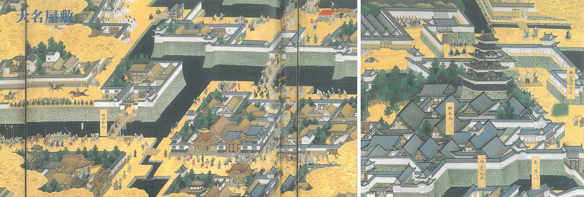 明暦3年(1657)の大火で初期の江戸は全滅したが、それ以前の様子をつたえるのがこの屏風絵である。右図はこの大火で完成後33年で焼滅し、再建されなかった天守閣と本丸。