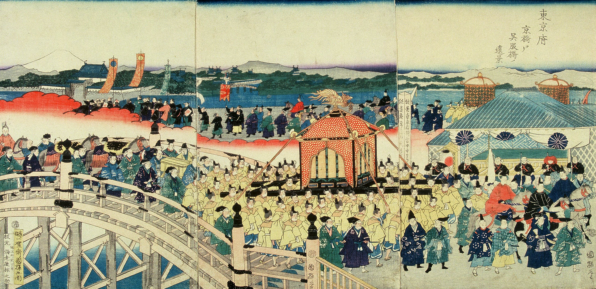 9月20日、天皇は二千人の諸藩兵に守られて京都を出発、天子様(天皇)を知らない江戸市民へ、天皇は不動であることを示す目的で、東海道を東へ向かわれた。岩倉具視の発案で、天皇は江戸市民が見たことのない鳳輦(ほうれん)に乗られ、公家は狩衣・直垂に威儀を正し、道中、稲刈りや漁業などを視察され、10月13日に呉服橋から和田倉門を通って城内に入った。