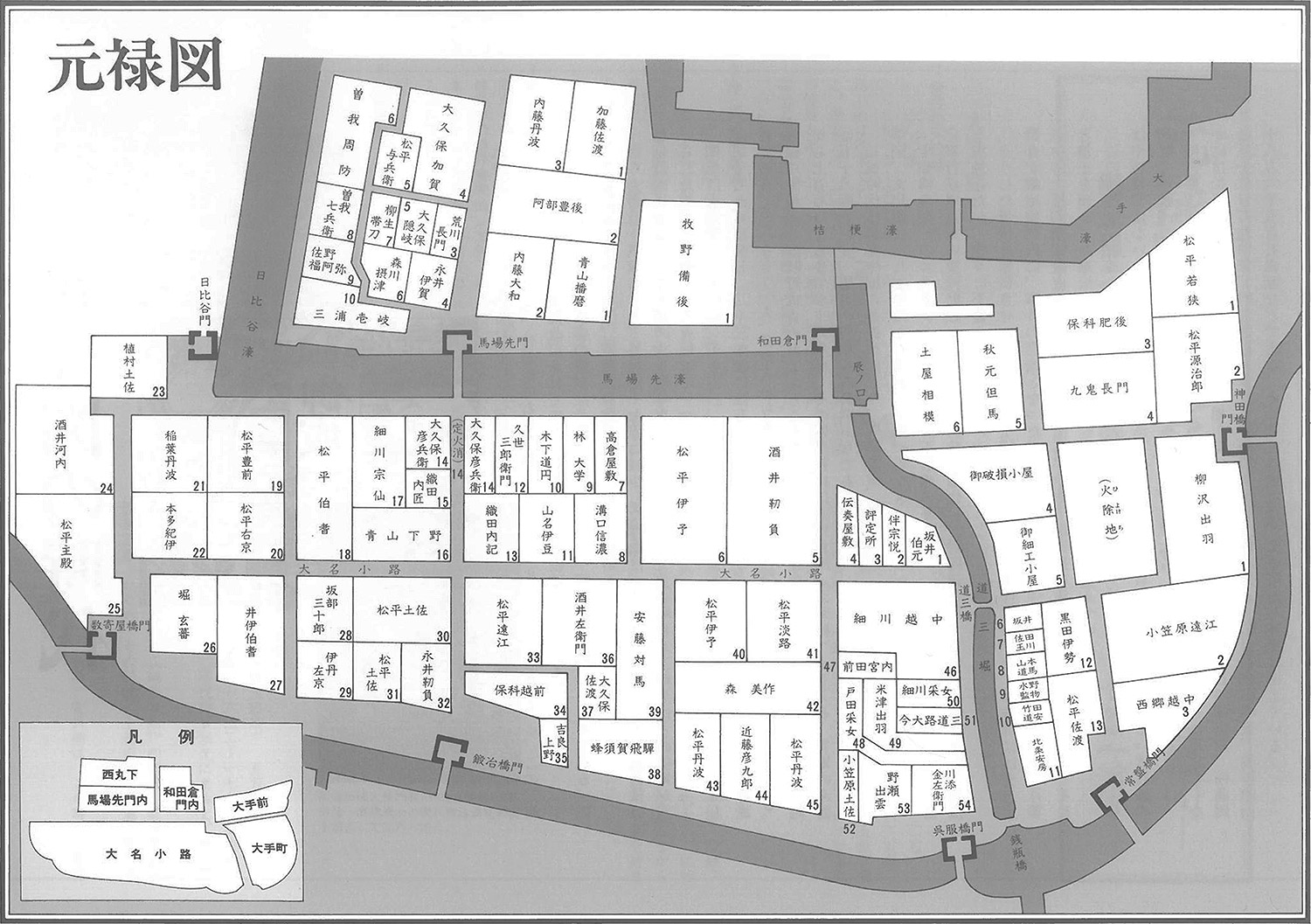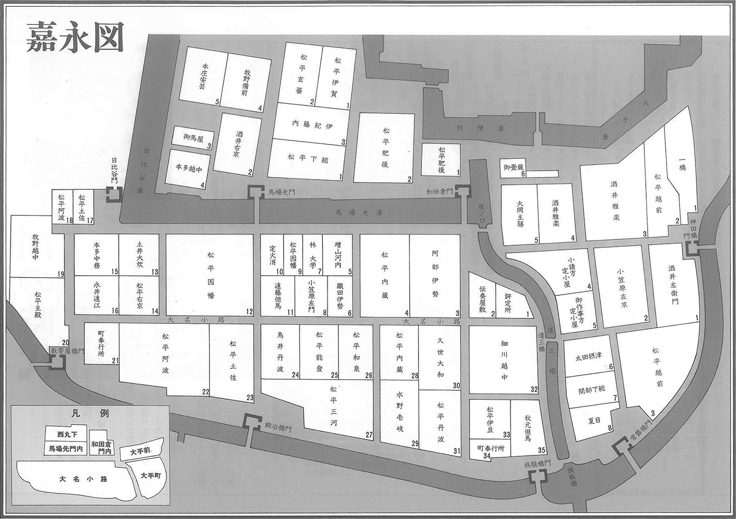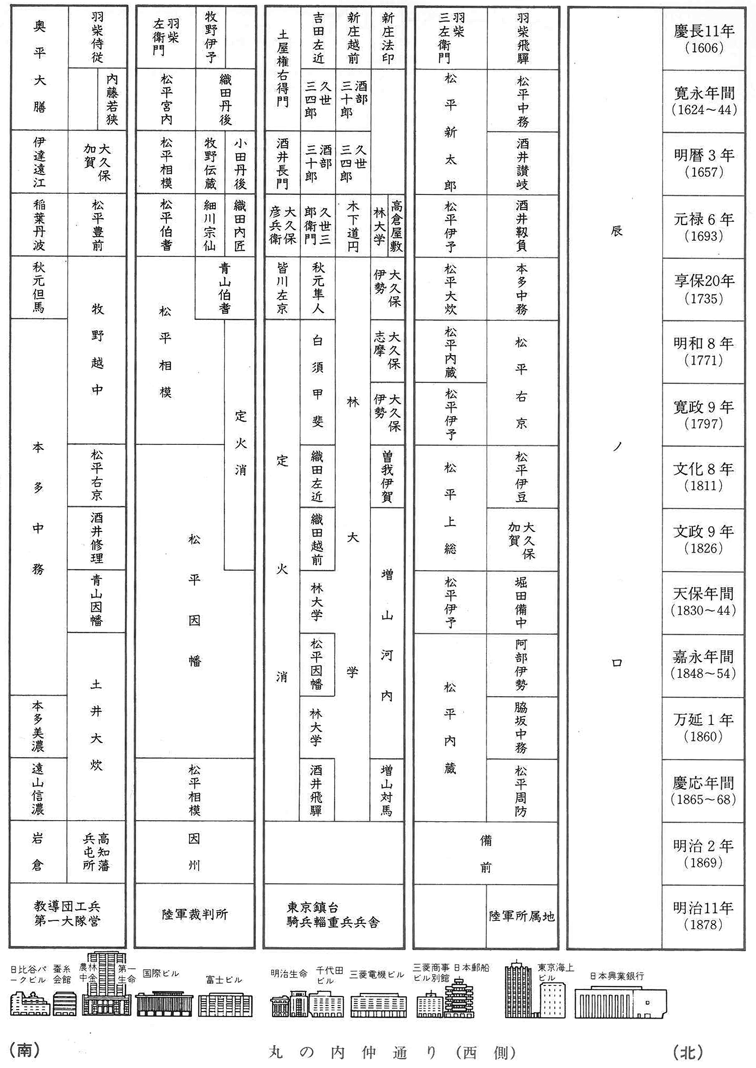 大名の屋敷群は譜代と外様に分かれ、おおむね今の祝田橋から皇居前広場にかけてが譜代の重臣、濠の外、今のビル街一帯が譜代と有力外様が混在する屋敷街であった。