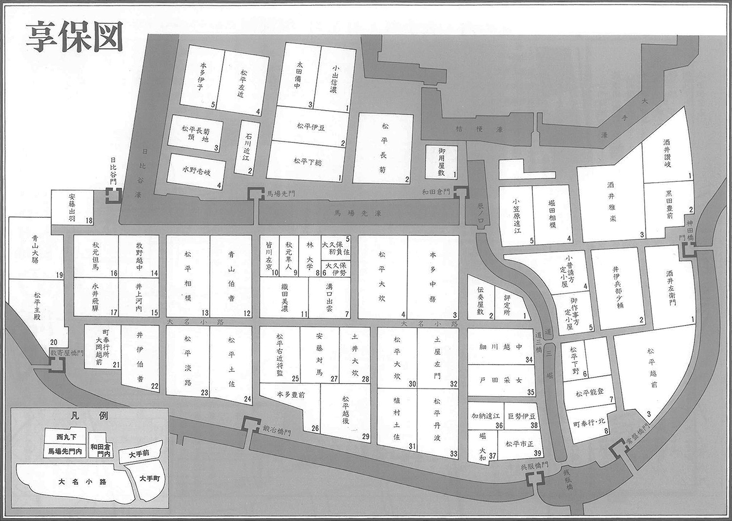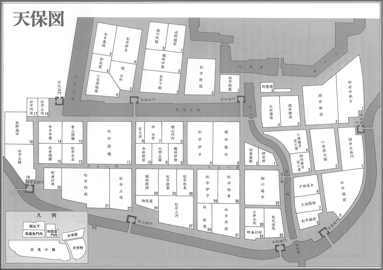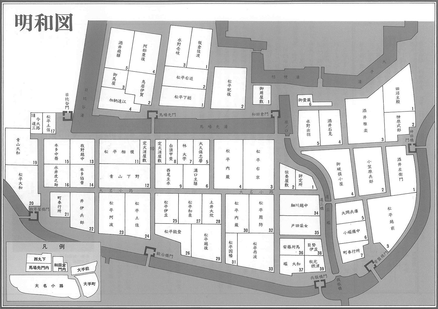 大名の屋敷群は譜代と外様に分かれ、おおむね今の祝田橋から皇居前広場にかけてが譜代の重臣、濠の外、今のビル街一帯が譜代と有力外様が混在する屋敷街であった。