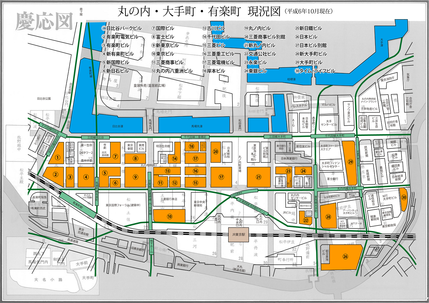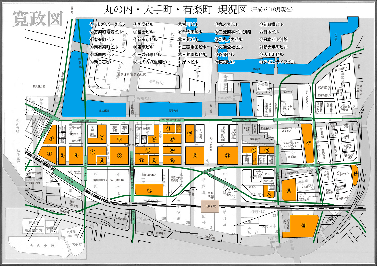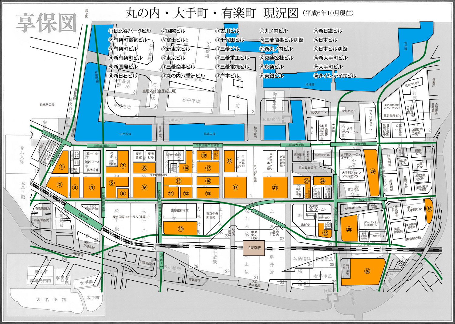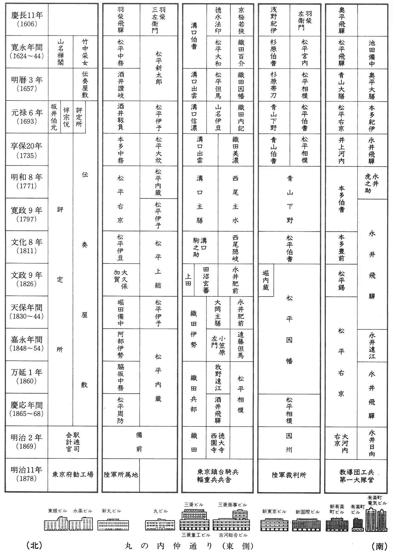 屋敷街の性格は、皇居外苑が老中・若年寄などの幕府重臣の役宅街、現ビル街は、譜代・外様の別なく親徳川大名と数人の旗本、医師、儒官、それに評定所、伝奏屋敷、南北の町奉行所、定火消屋敷などで占められていた。江戸時代、そこに在住した大名は、ゆうに一千人を越えたであろう。