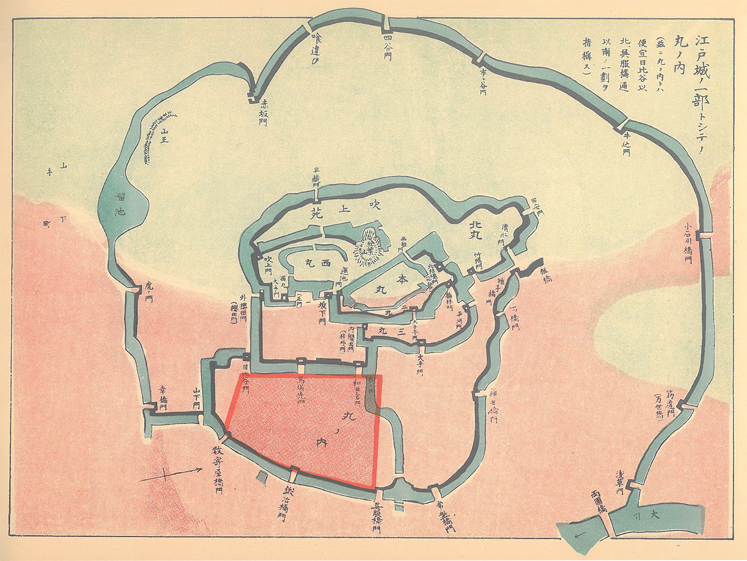 「丸の内」の第一歩は、天正18年(1590年)8月1日、小田原北条氏を討滅した豊臣秀吉の政策により、徳川家康が東海から関東六州=のち八州=の太守として江戸に入ったとき、江戸城御曲輪内、すなわち丸の内としてしるされた。以来江戸幕府崩壊の慶応3年までの277年間、丸の内は“天下の総城下・江戸”の中枢として機能してきた点は、今日の丸の内と同様である。