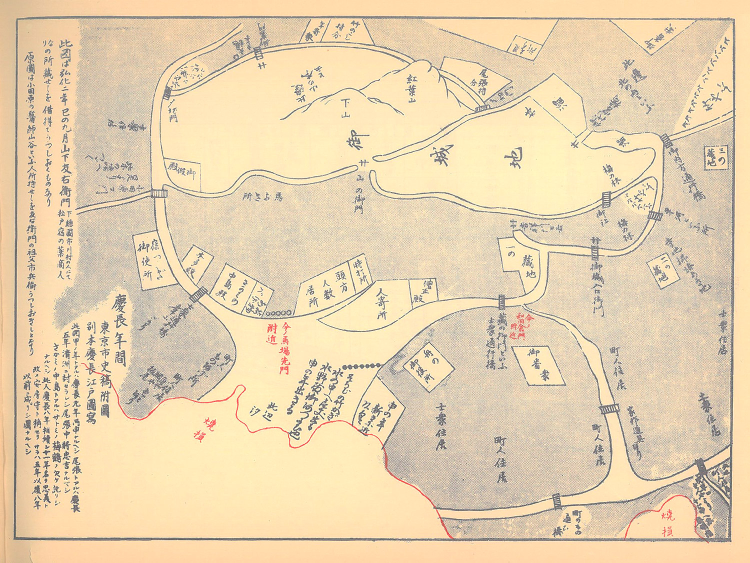 この絵図は「武州豊嶋郡江戸庄図』といい、最初の木版図である。全体を美しく描くことに重点がおかれ、絵図の特徴である大名屋敷名を、屋敷の向きと一致させる方法をやめ、一定方向に統一してあるので、回転させながら見る必要がなくなった。そのため原典のひとつとされ、寛永年間だけでも五年、七年、九年、十三年、十五年と、屋敷名を訂正するだけで重版されている。以降も刊行はつづき、ここに原本とした図も、寛永から百六、七十年たった寛政二年(一七九〇)に、探検・測量の大家、近藤重蔵守重が模写したといわれる寛永九年図である。