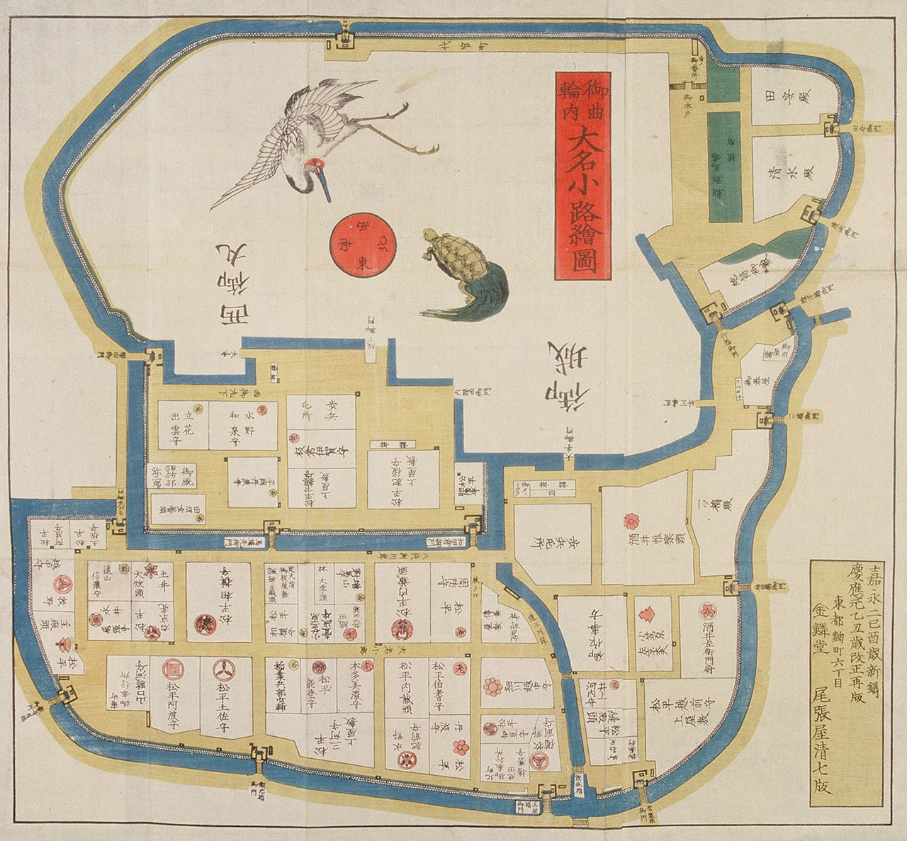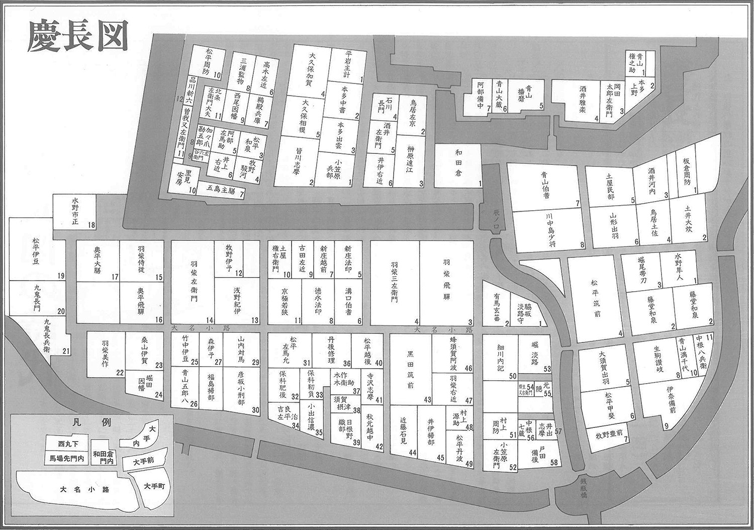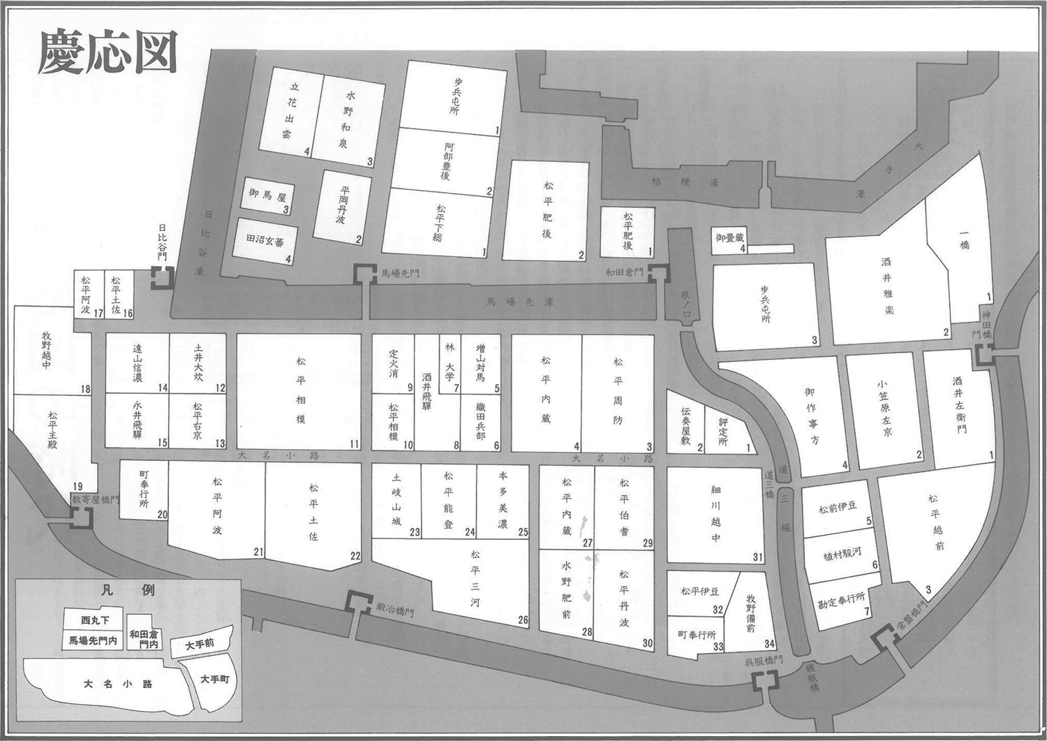 本図は慶応元年(一八六五)に再版発行の金鱗堂尾張屋清七版『御曲輪内・大名小路絵図』と、同三年の高井蘭山校訂、岡田屋嘉七版『慶応改正御江戸大絵図」をベースとした。