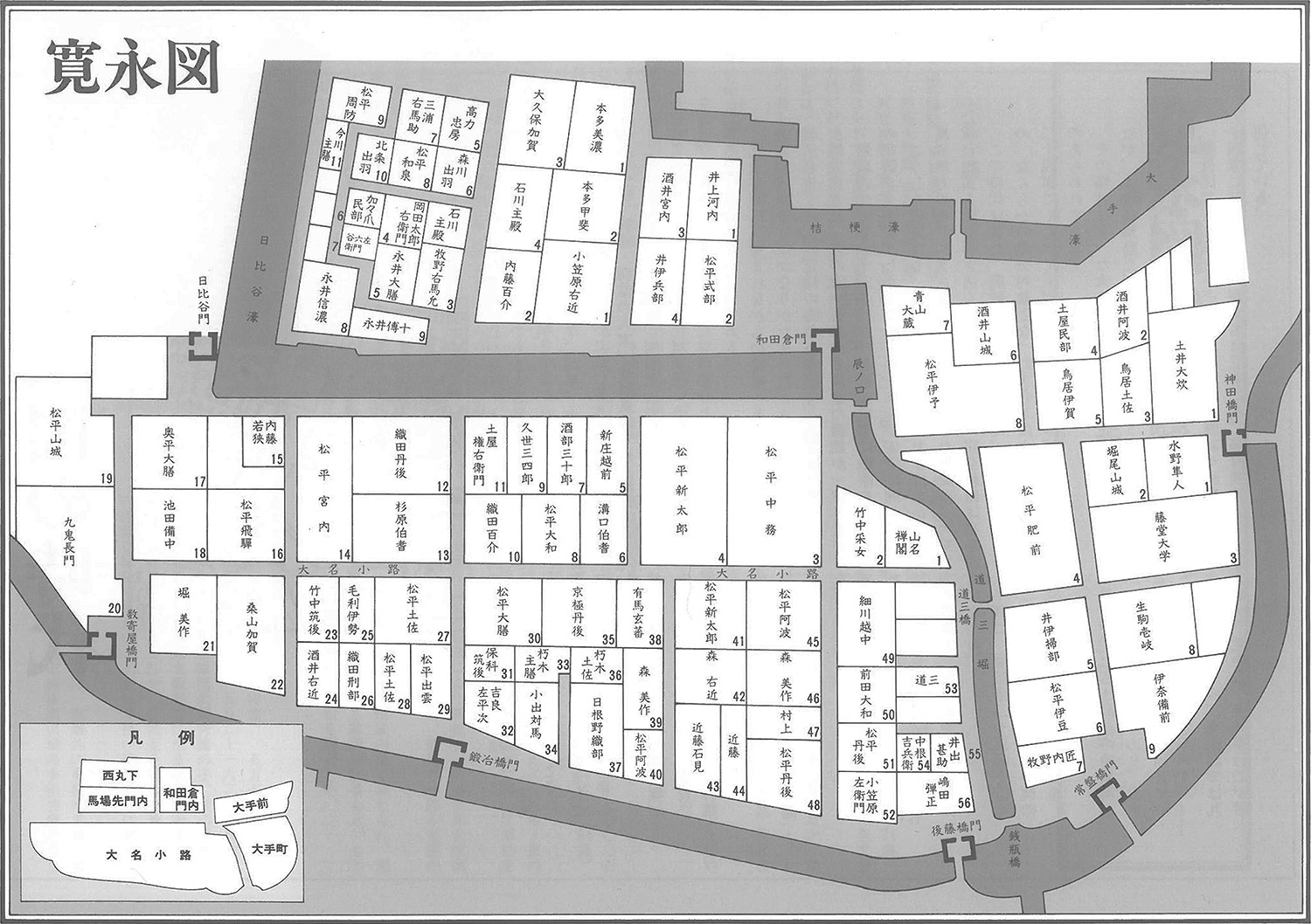 慶長図で百九家をかぞえた大名家は、廃絶や減封移転を機会に整備もすすみ、寛永図では九十四家に減り、うち外様大名は三十二家。幕府閣僚としては大老一、老中五、寺社奉行二が居住している。