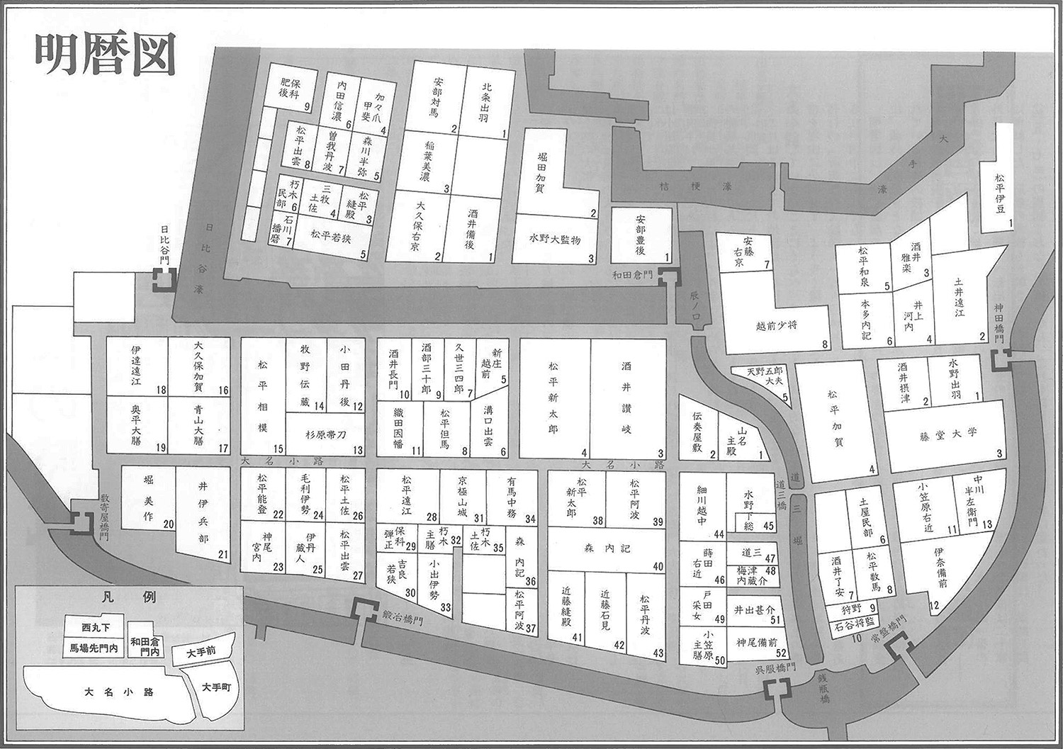 明暦図は、焼亡直前のいわゆる”古江戸”の姿をつたえる貴重な一枚だが、この大火を機会に、城外へ立退きとなった紀伊・尾張・水戸の御三家が、移転前のまま城内の半蔵門側に描かれている最終の絵図でもある。