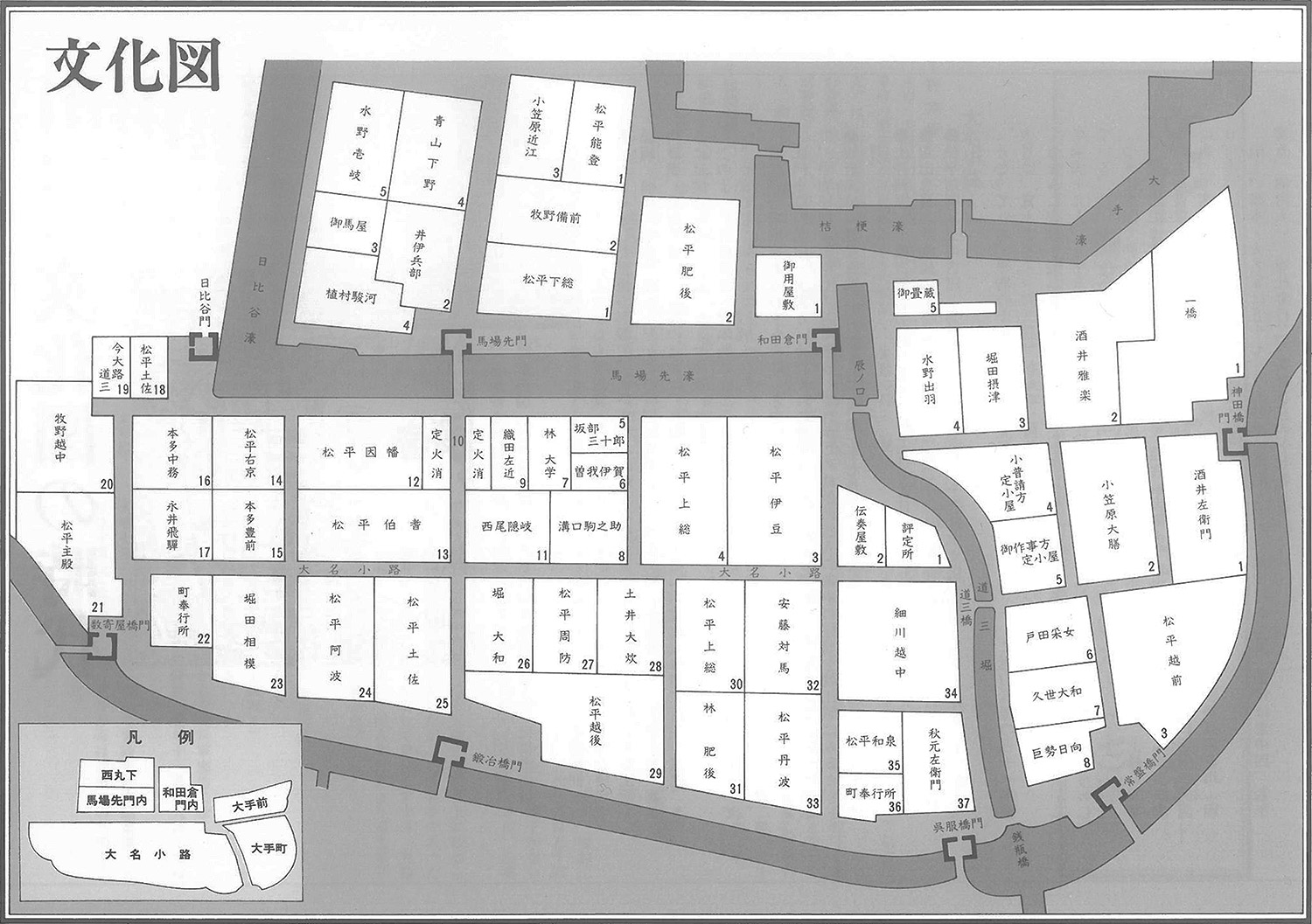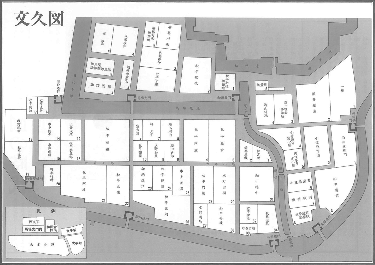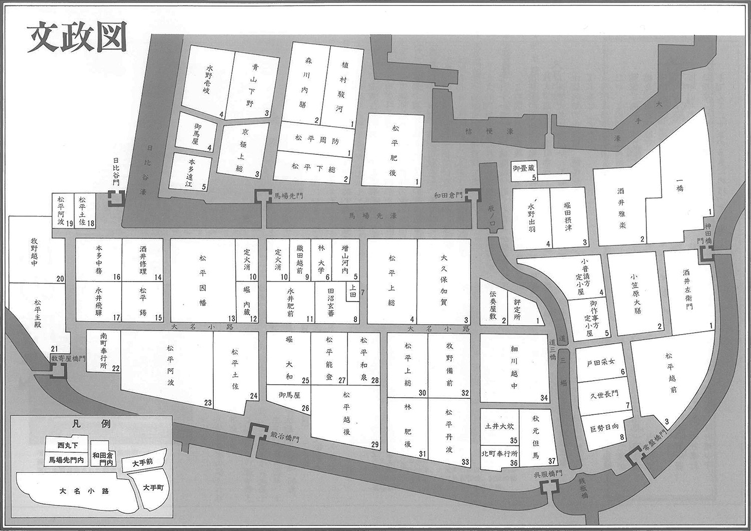 『文久図』の屋敷数は五十五。うち幕府機関は評定所、伝奏屋敷、南・北町奉行所、畳蔵、馬屋などである。