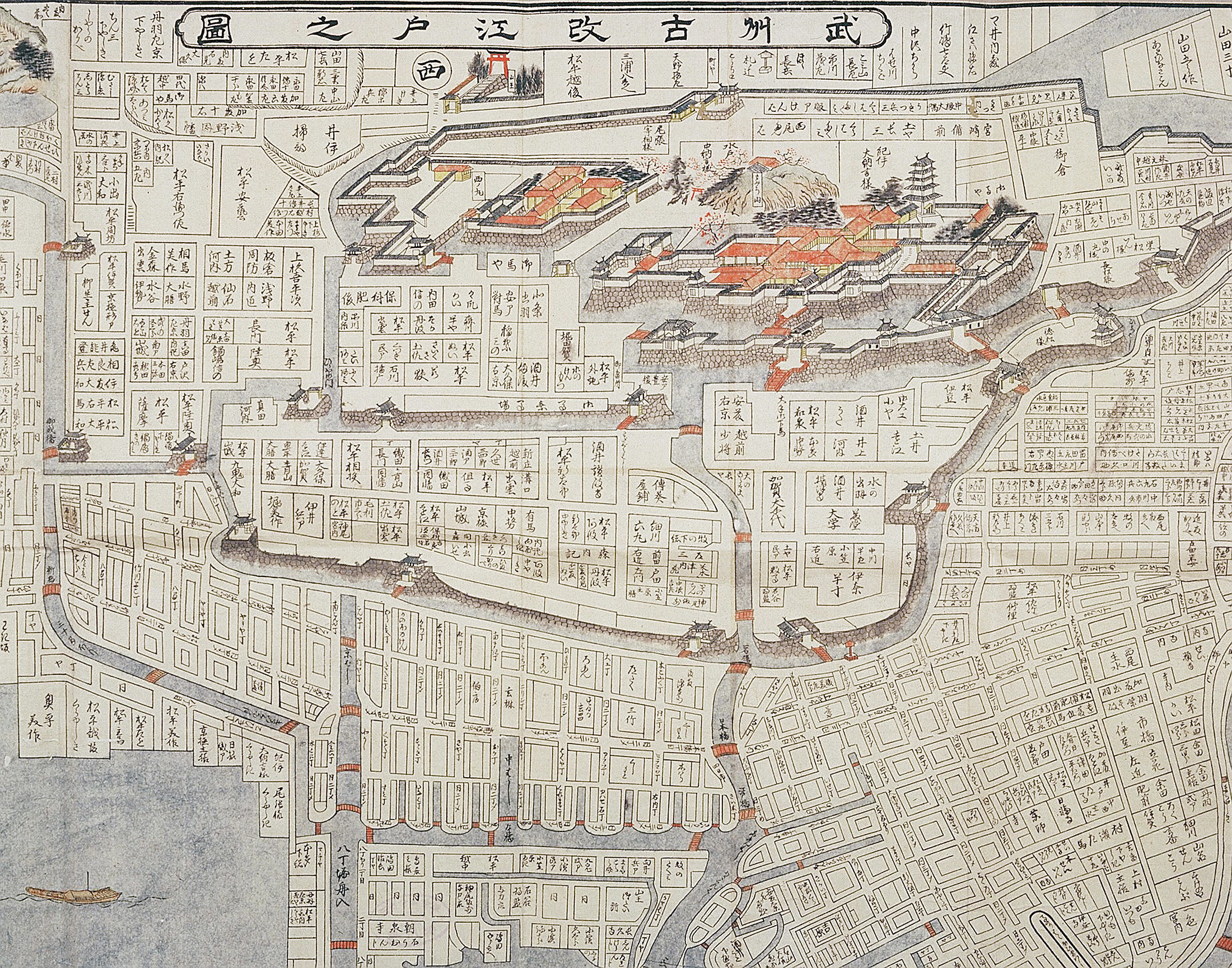 この図のおもしろい点は、明暦大火で焼失したままの江戸城天守閣が百四十年間も描き継がれていることである。そこに精度云々の問題以前に、絵図としての美しさが評価されてきたことがわかり、増補改訂された実用部分と、天守閣焼失以前の寛永図の複刻部分とが、なんの抵抗もなく混合しているのである。
