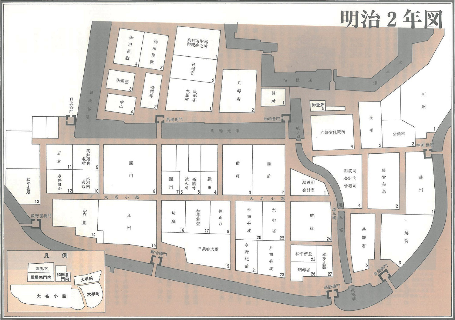この時期約二十年間の特徴は、二百六十余年間、天下の総城下の偉容をささえてきた大・小名屋敷が、明治二年から三年にかけてほとんど明治新政府の庁舎に接収されたことで、ちょうど太平洋戦争後、この地一帯のビルが連合軍に接収されたのに似ている。その転変の激しさは、先出の『慶応図』と比較するとよくわかる。