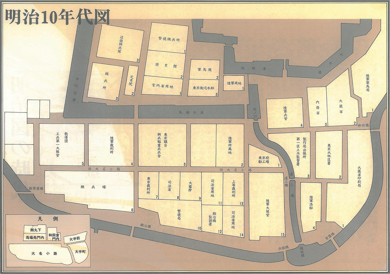 明治政府当面の課題は国軍の創設であった。帝国軍隊は6鎮台、営所14を置き、将兵数は平時4万、戦時7万と定め、毎年1万人を徴兵することに決定した。この影響で、丸の内一帯はよりいっそう「軍の町」としての色彩が強まった。