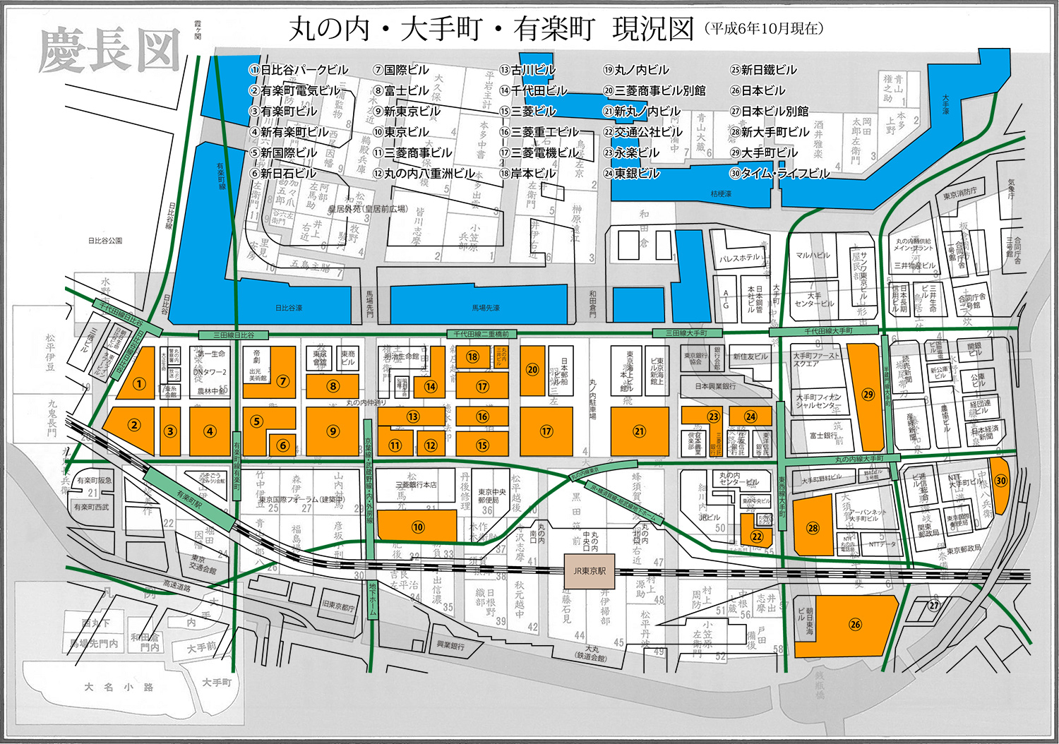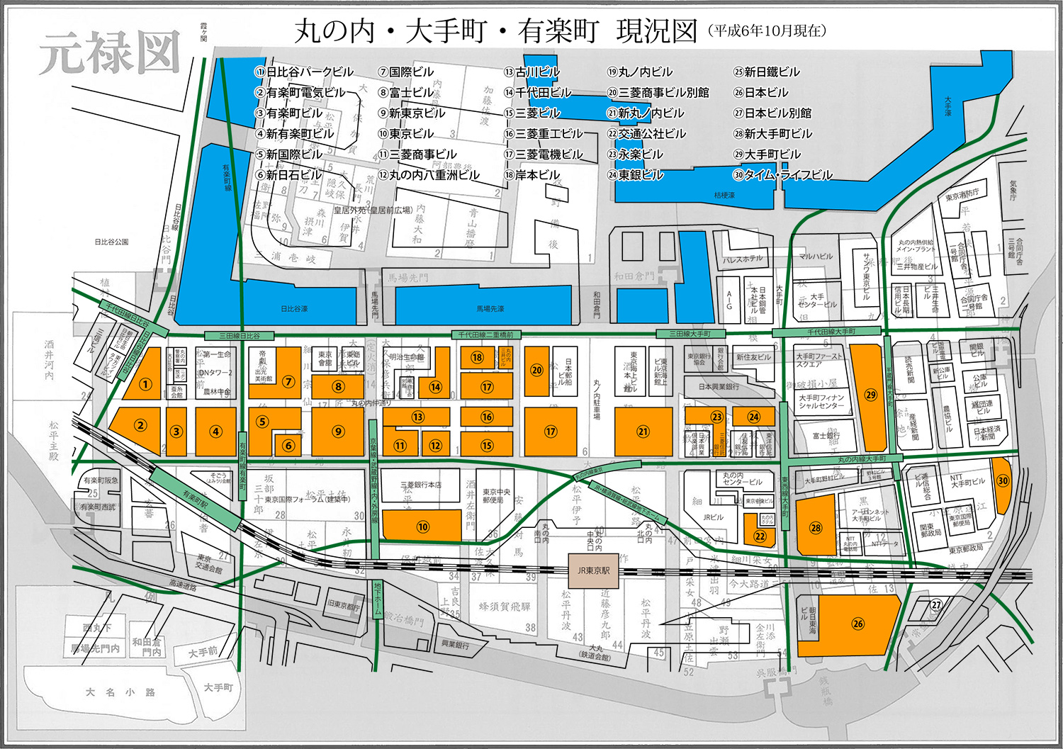 高層ビルから目を転じると、そこには緑豊かな皇居=旧江戸城があります。