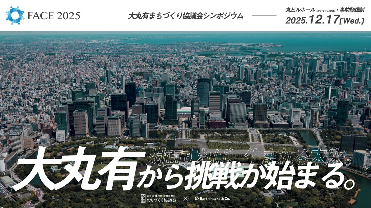一般社団法人 大手町・丸の内・有楽町地区まちづくり協議会(以下、大丸有まちづくり協議会)は、東京都心部にあるビジネスの中心地、大手町・丸の内・有楽町(大丸有)地区の未来のまちづくりについて、様々な領域から多彩な有識者、専門家、実践者の方々をお招きし、都市の課題について深く議論するシンポジウム「FACE」を2019年より継続開催しています。FACE HP